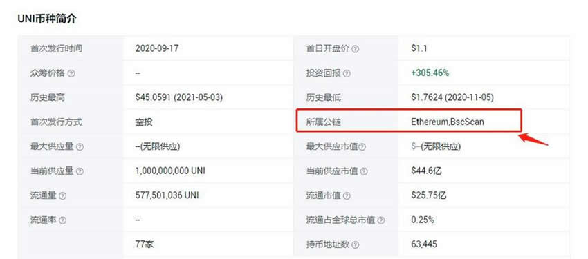 3. 如果不清楚该币种属于什么公链,可以根据币种简介的公链信息去辨别,像UNI币所属公链是Ethereum,BscScan,就可以同时通过这两个区块链浏览器去查询该币种的代币合约地址信息