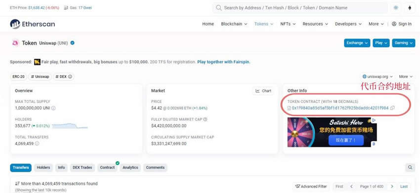 查一个币的合约地址方法有该币种对应的区块链浏览器或者官网查询两种。以下是通过区块链浏览器查找UNI代币合约地址的教程: