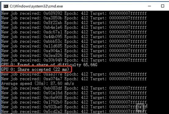 4.稍等一会儿就可以看到“Share accepted”字样,这时候矿机已经在挖矿了。