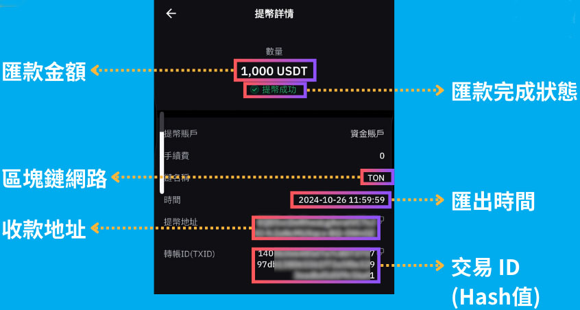 以加密货币汇款来说,作为证据的截图应至少包含:已经汇款的交易金额、时间、网路、收款地址、交易ID、汇款完成状态。