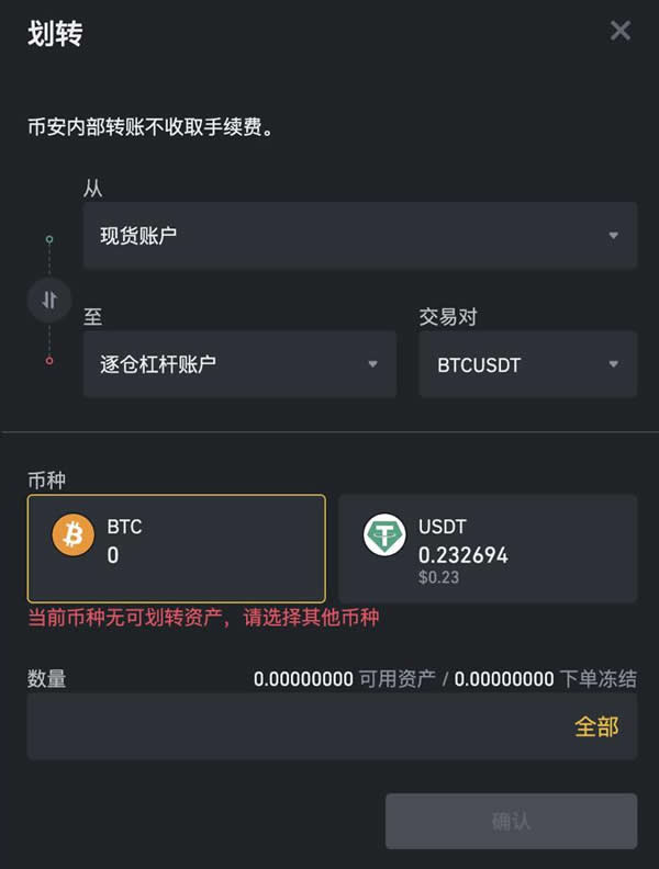 11、 在弹出的转账页面,确认从“现货账户”转到“逐仓账户”(如BTCUSDT逐仓账户),选择币种和数量,点击【确认】。