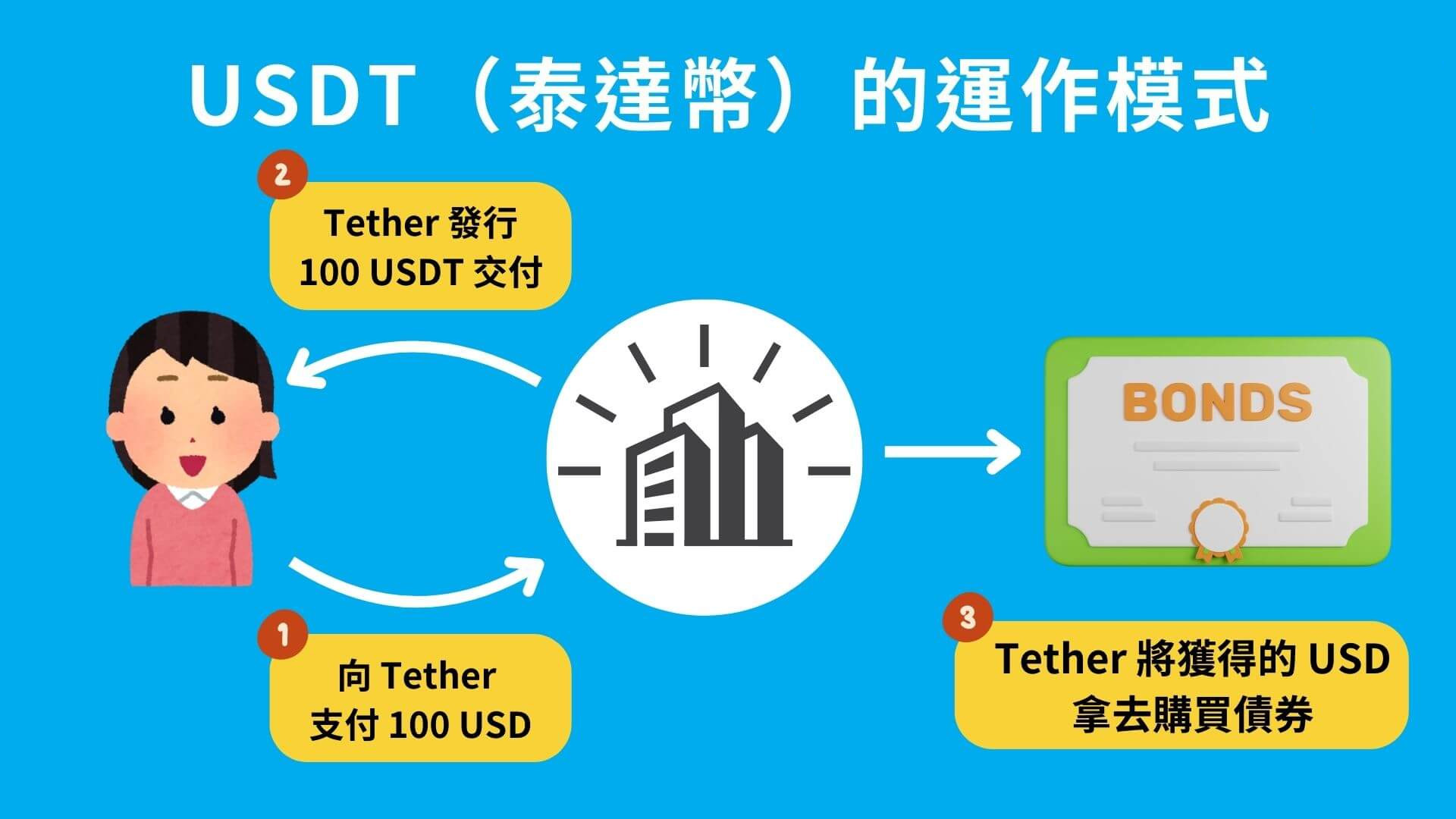 当有人购买USDT 时,Tether 公司会用美元发行等值的USDT,而这些美元会被Tether 存起来,并用来投资一些低风险的金融工具,譬如美国国债。