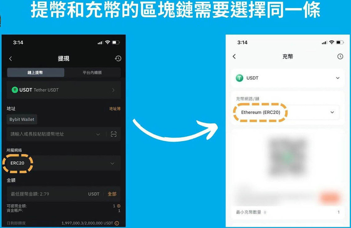 注意「汇出端」和「收款端」需要选择同样的区块链,例如你在交易所提出泰达币时,例如:使用ERC(代表以太坊)汇出,则收款端也需要使用以太坊网路收款。