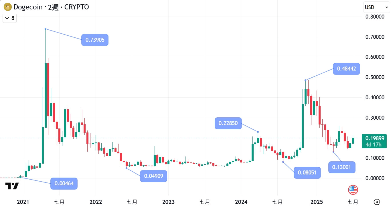 然而,凭借轻松的品牌形象与网路文化的扩散,加上马斯克等名人多次公开提及,狗狗币在2021 年曾引发广泛关注,其价格一度由0.01 美元飙升至0.73 美元。