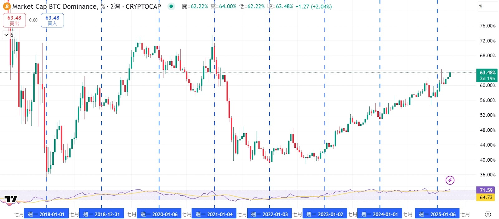 - 2025 年初:BTC Dominance 快速突破63%,一路攀升至约66%,显示市场资金大幅集中于比特币,整体风险偏好明显下降,山寨币相对表现疲弱,尚未出现季节转换的讯号。