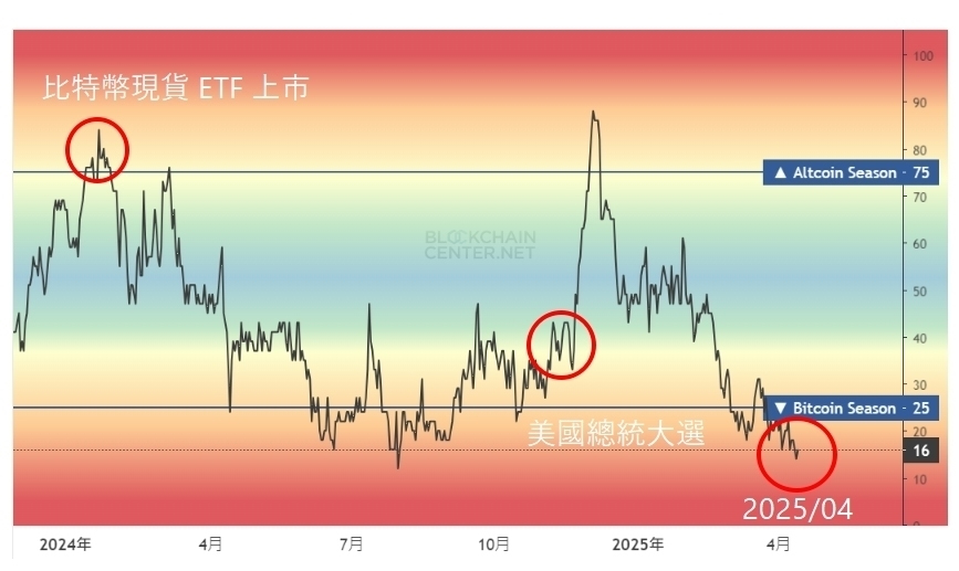 - 2025 年4 月:山寨币指数跌破20,重新进入「比特币季节」区间,显示市场资金转为保守,再次集中于BTC。