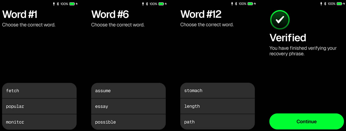 在设备屏幕上出现提示时,通过选择正确的单词来验证您在助记词卡上记录下的对应助记词。