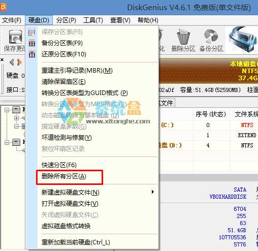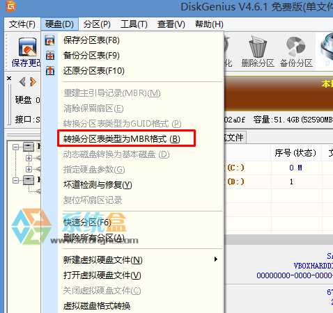 5、删除分区后,装换硬盘分区表类型 为 MBR 格式,同样还是从"硬盘"——"转换分区表类型为MBR格式",然后保存更改(以下为图示,此时该项为可点,如不可点说明已经转换好了。)