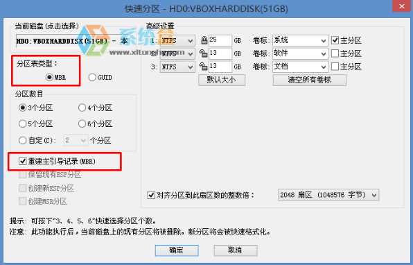 6、转换完成后,执行快速分区,分区大小几磁盘个数自己选择,确保分区表类型为MbR ,及勾选了重建主引导记录MBR,按下确定后开始分区;