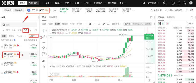 5、以ETH/USDT杠杆交易为例:选择【杠杆】—【USDT】—【ETH/USDT】。