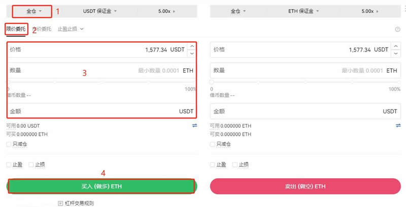 选择【全仓/逐仓】、【USDT保证金】、【杠杆倍数】、【限价委托】— 输入【价格】、【数量】或者【金额】—点击【卖出(做空)ETH】—【确认】。