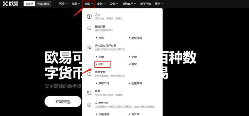 3、点击官网首页左上方【交易】—【杠杆】。