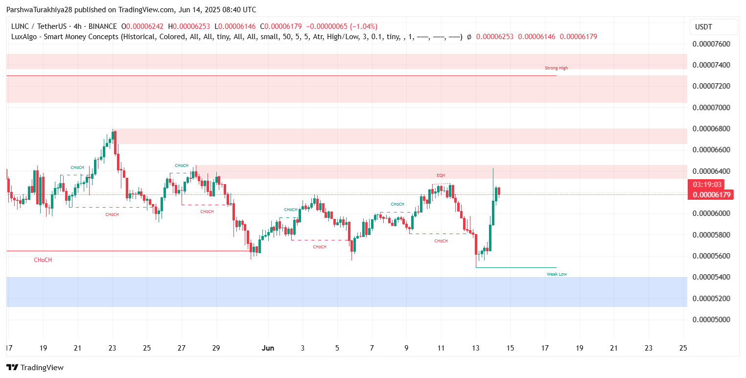 6月13日至14日,LUNC价格走势呈现强劲的V型反弹,从0.000055美元的支撑位开始,这与4小时图上可见的历史需求区域一致。该区域曾是此前反转的跳板,当前价格走势也与此模式相呼应。在成交量放大的支撑下,一根看涨吞没K线帮助LUNC收复了0.000060美元的关口,这是6月份中期关键的支点。