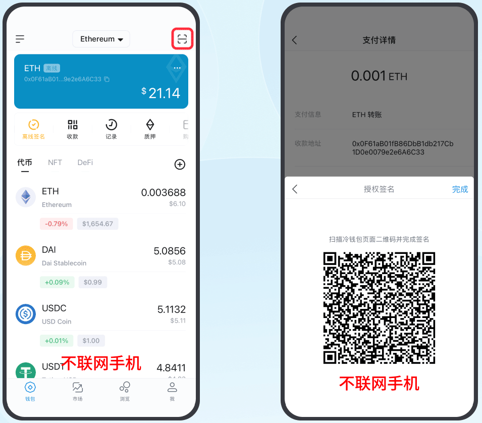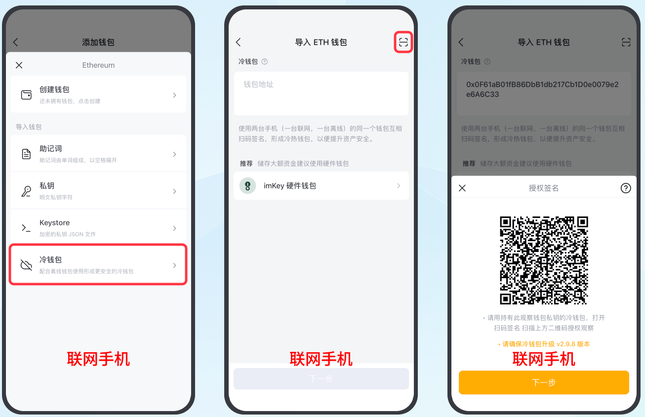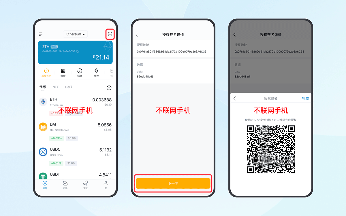 3. 点击右上角的扫描按钮,扫描不联网手机显示的二维码获取冷钱包地址,然后点击「下一步」,进入授权签名界面。