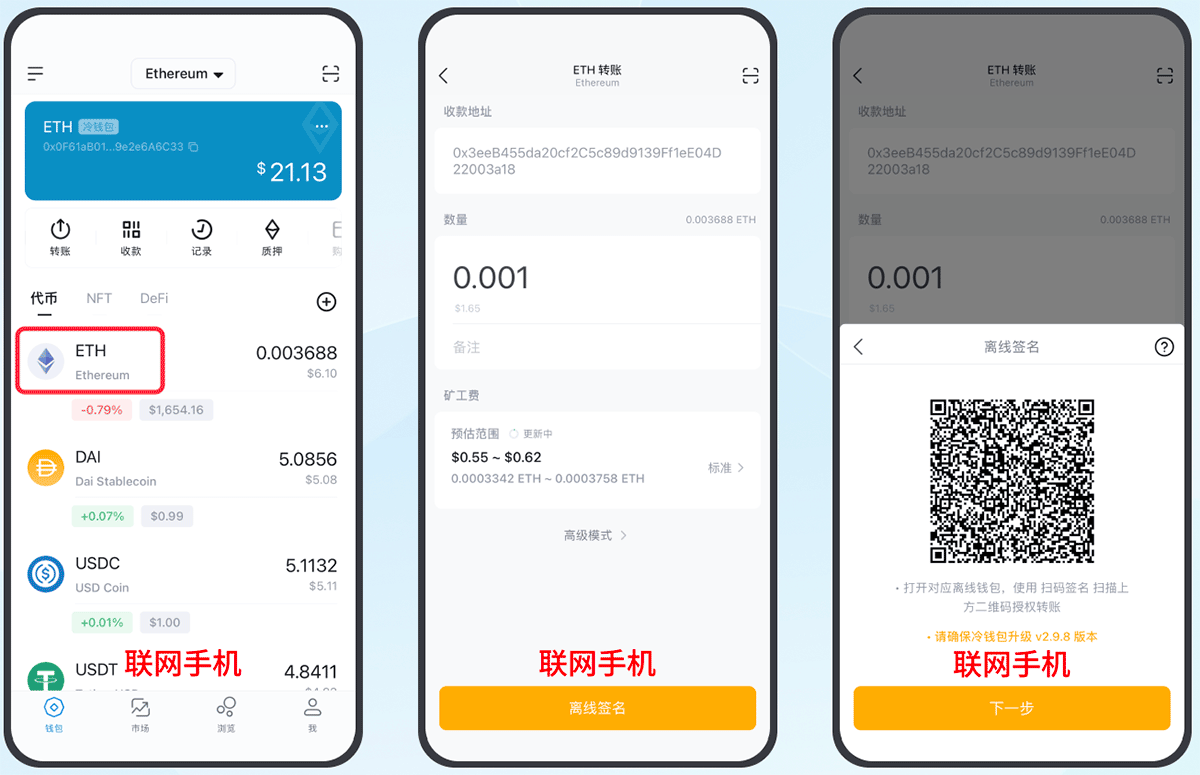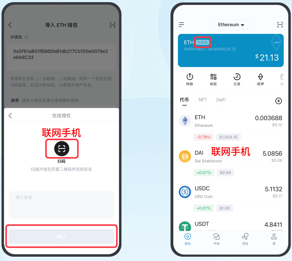 未联网的手机为冷钱包,包含私钥信息联网的手机为观察钱包,不包含私钥信息观察钱包可以在冷钱包离线签名的情况下进行转账,如果没有冷钱包离线签名,观察钱包无法转账