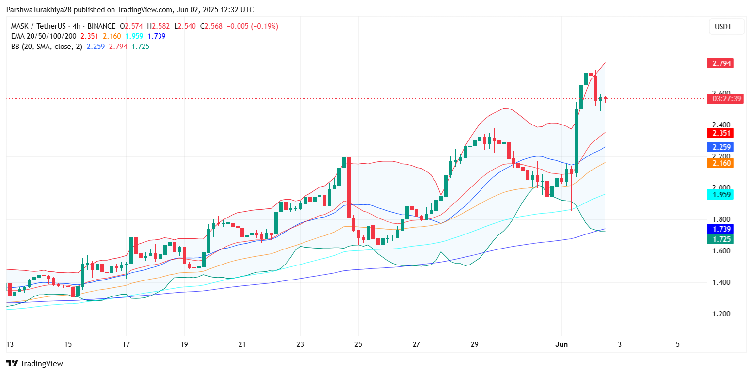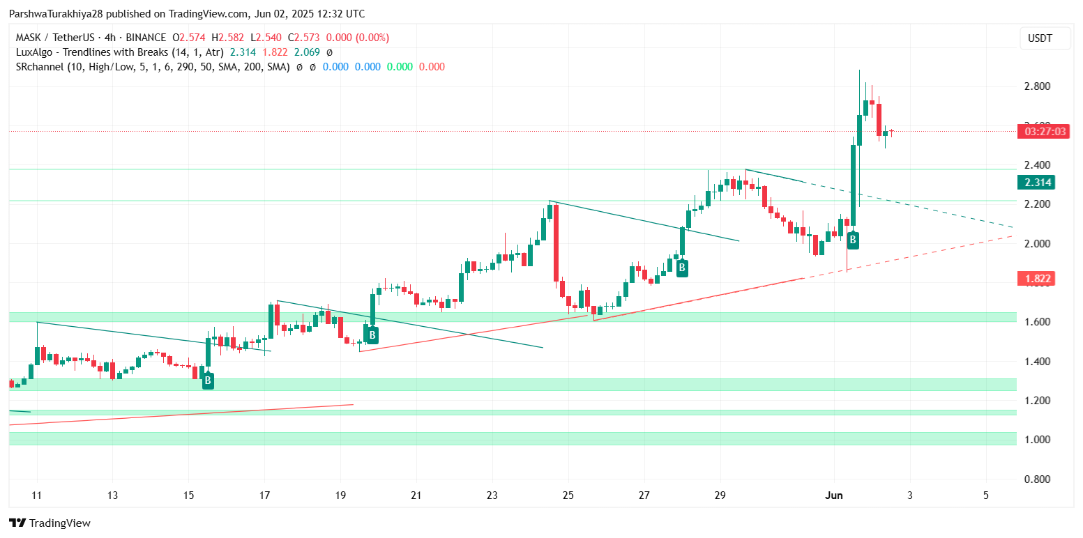 Mask Network 价格近期的飙升源于其突破 4 小时图上呈现的下降楔形形态。此次突破得益于强劲的看涨成交量以及突破 2.30-2.40 美元需求区间的明显支撑,此前该区间曾限制了其数周的上涨空间。