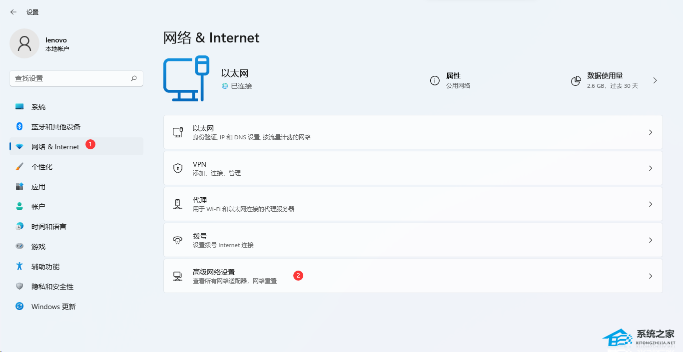 2. 设置窗口,左侧点击【网络 & Internet】,右侧点击【高级网络设置(查看所有网络适配器,网络重置)】;