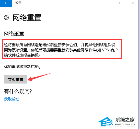 4. 网络重置,会有段说明:这将删除所有网络适配器然后重新安装它们,并将其他网络组建设回为原始设置。确定没问题后,再点击【立即重置】即可;
