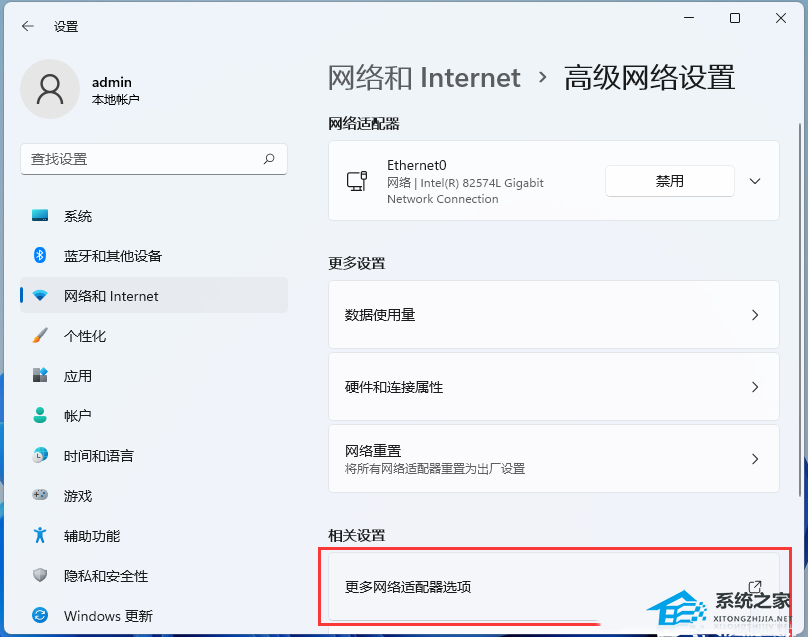3. 更多设置下,点击【网络重置(将所有网络适配器重置为出厂设置)】;