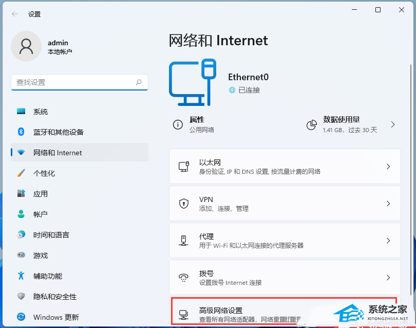 2. 设置窗口,左侧边栏,点击【网络和 Internet】,右侧点击【高级网络设置(查看所有网络适配器,网络重置)】;