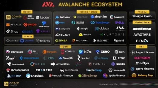 由于雪崩协议高吞吐量及EVM 兼容的优势,使得上主网上线短短不到半年的时间就吸引了超百个应用在雪崩链上搭建,不管是DeFi、钱包、工具类、 NFT、隐私等都已经有越来越的项目迁移过来,常见的DeFi 项目如Sushiswap 、 Ren 、 bZx protocol、Reef Finance 等都已经迁移成功。