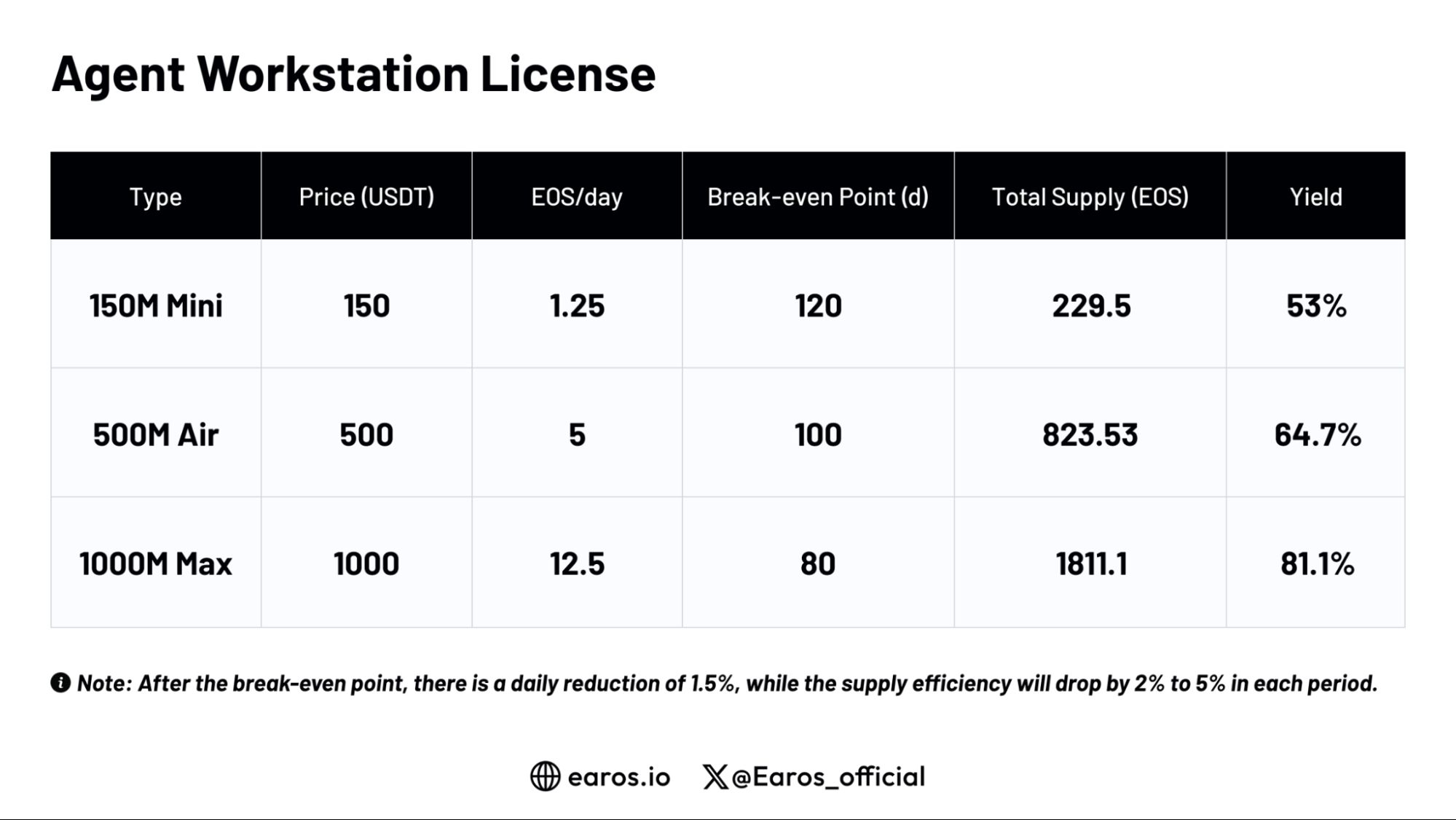 参与者需要购买许可证。通过购买许可证,参与AW的运行,从而参与者可以获得 Earos 生态系统的原生代币 EOS 作为奖励