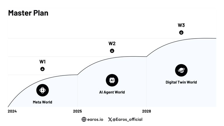 凭借 W1 积累的初始用户和充足的资金,Earos 为这一阶段奠定了坚实的基础,并将专注于引入 AI 代理平台,以鼓励更多第三方支持者。这一阶段将标志着从人类治理到技术治理的过渡,AI 技术与治理的融合将为基于区块链的地球孪生(W3 阶段)奠定基础,确保每个用户的资产所有权。