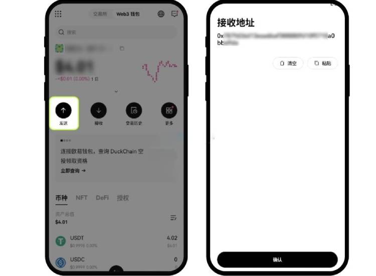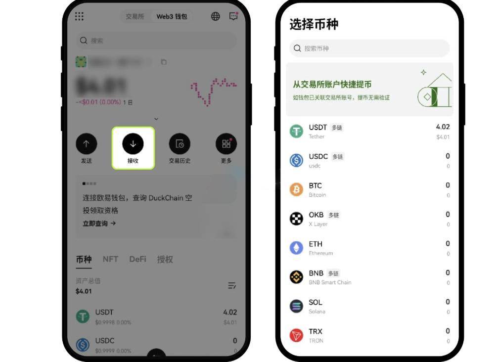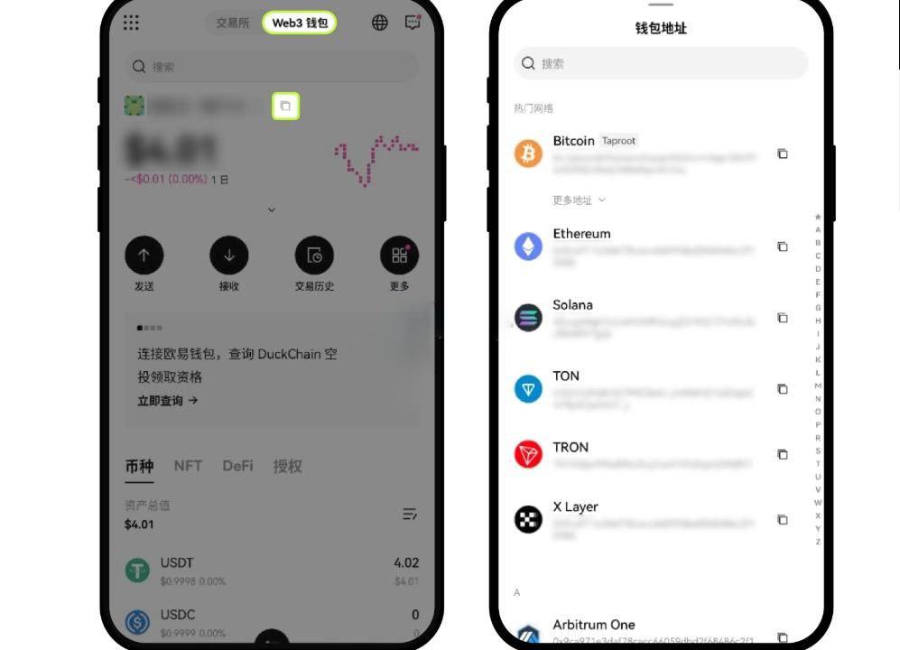 1、点击钱包首页账户旁的【复制】按钮-选择您想交易的网络所对应的钱包地址-点击【复制】-发送给提币方进行转账即可接收资产