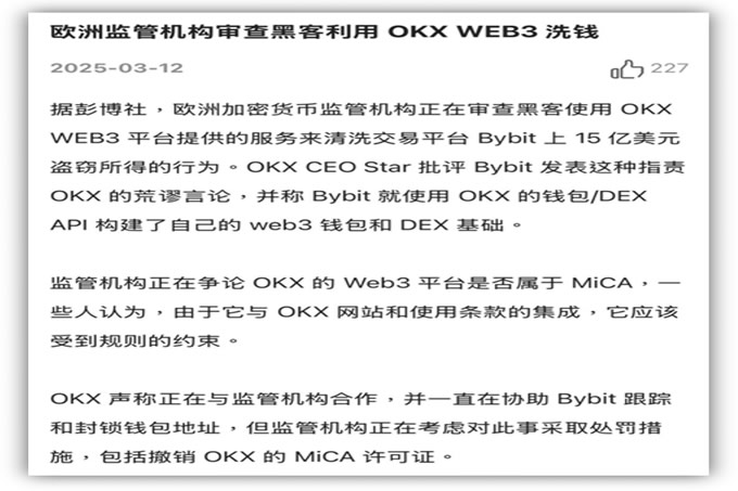 OKX这边就没那么顺了。Web3钱包的DEX聚合器交易停了,官方说是“升级”,但真相是Bybit惹的祸。前阵子Bybit被黑客搞了1亿美金,脏钱跑OKX DEX洗了一波,欧盟监管急了眼。OKX刚拿MiCA牌照,想做合规标杆,结果撞这枪口,只能先停下来保命。