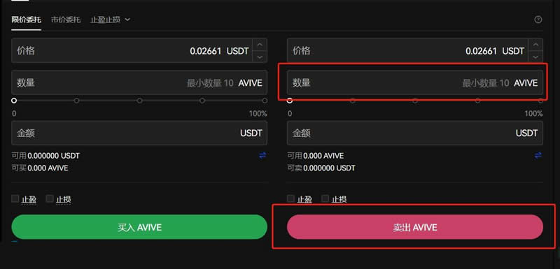 9、输入卖出AVIVE数量,点击卖出AVIVE就可以置换成USDT