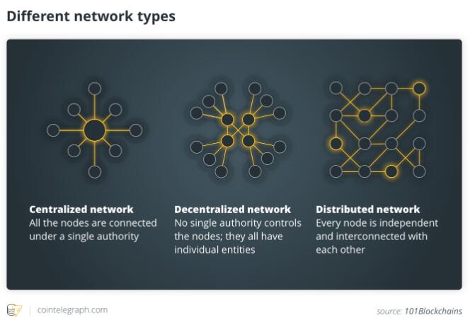 下面的图片详细说明了集中式,分散式和分布式网络的结构: