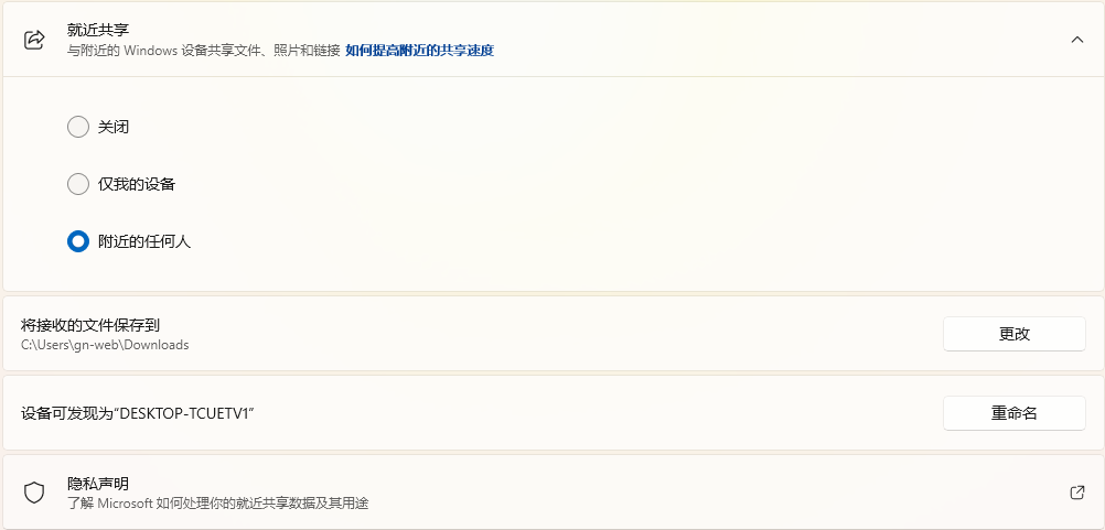 Windows 10/11系统也提供了类似苹果“隔空投送”的便捷体验,那就是“就近共享”,通过蓝牙发现设备后利用Wi-Fi进行高速传输。操作相对局域网共享文件夹稍微简单一些,无需复杂设置,但传输稳定性可能没有局域网共享那么好,而且不支持传输超大文件。步骤如下: