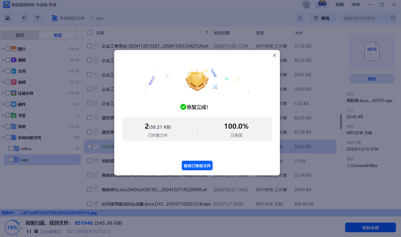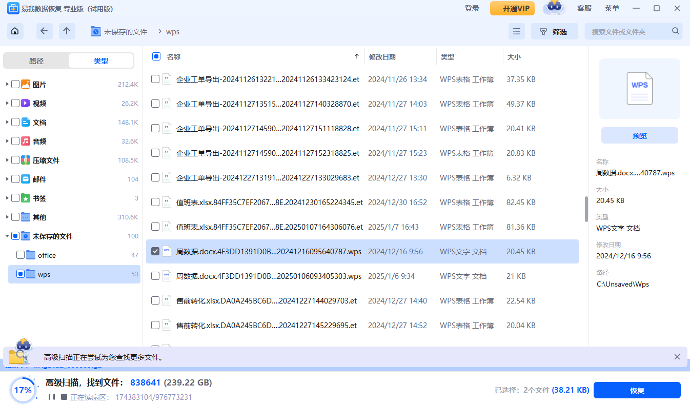 3.扫描完成后或在发现对应文件后暂停/终止,找到并勾选丢失的文件进行恢复,如果您记得原始文件路径,可以通过路径找到数据,否则,您可以通过类型找到丢失的文件。右上角搜索文件或文件夹名称,可以帮助您快速找到所需文件。我们可以直接查看“未保存的文件”,找到文件进行预览恢复。(文件需要是office或wps文档)