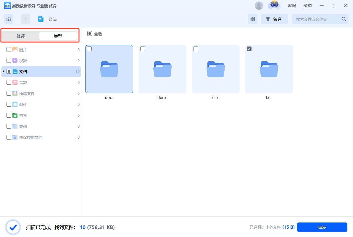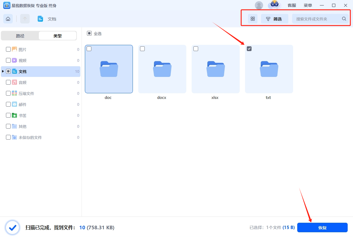 步骤3:通过筛选、搜索、预览等方式找到需要恢复的文件后,勾选文件并点击“恢复”。