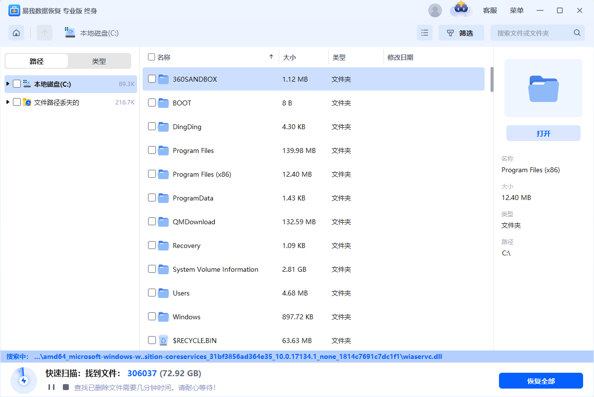 3.扫描完成后或在发现对应文件后暂停/终止,找到并勾选需要的文件进行恢复。如果您记得丢失文件的原始文件路径,可以通过路径找到数据,否则,您可以通过类型找到丢失的文件。右上角搜索文件或文件夹名称,可以帮助您快速找到所需的文件。如果想要恢复C盘所有数据,请勾选后点击“恢复全部”即可,随后选择保存路径并点击“保存”。(切记不要将文件保存到C盘,这极有可能导致原始文件被覆盖)