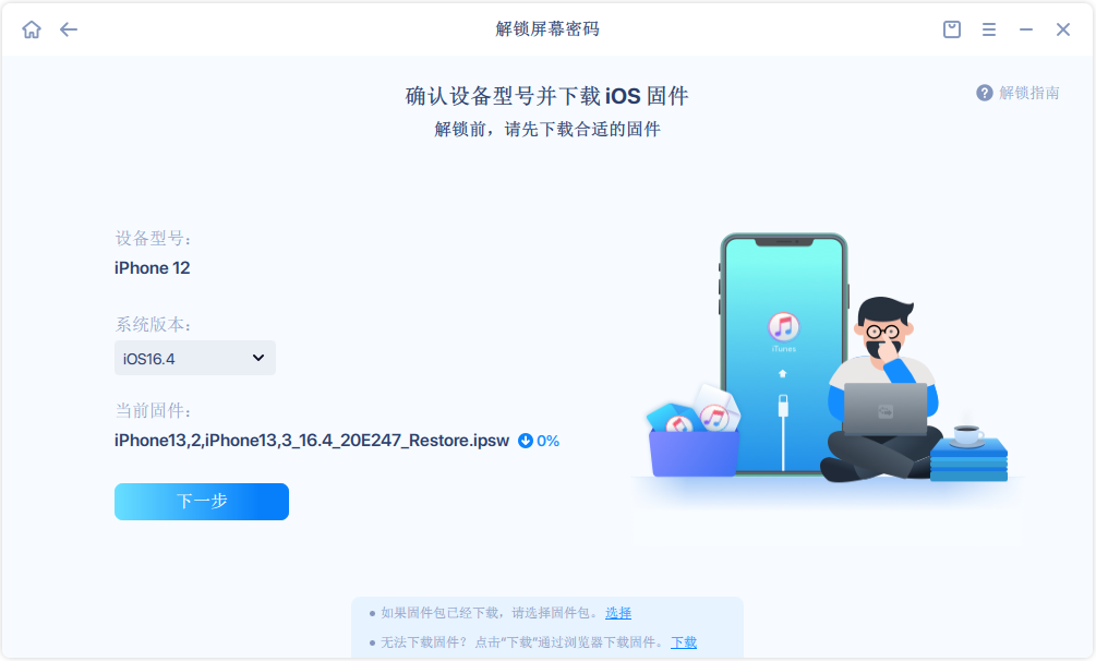 步骤 4. 确认设备型号,点击“下一步”,在线下载iOS固件。