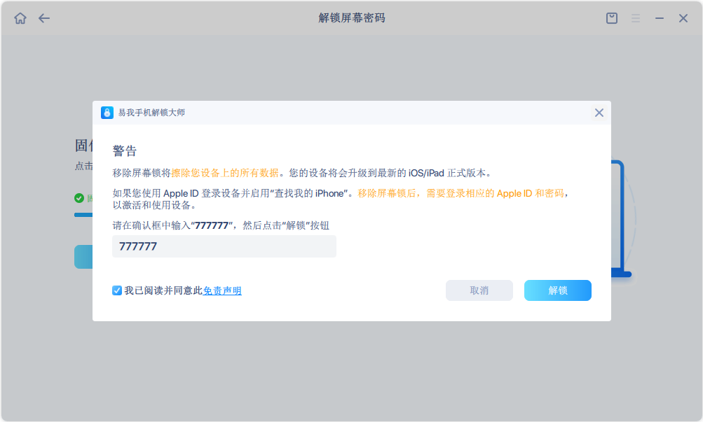 步骤 7. 解锁过程将擦除您iOS设备上的所有数据。为避免误操作,您需要在确认框中输入 777777 ,勾选“我已阅读并同意此免责声明”,然后点击“解锁”。