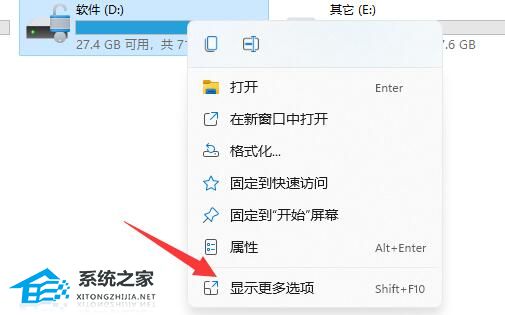 2. 这时候可以右键d盘,选择“显示更多选项”。