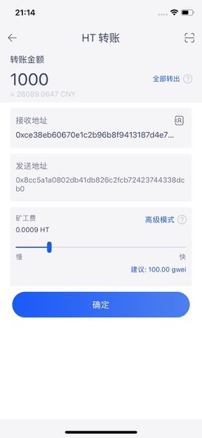 2、 选择转账,输入转出地址和转出金额,调整矿工费
