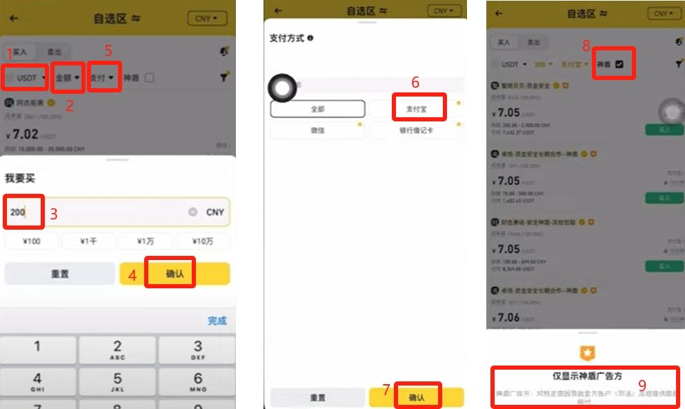 在这里我就用自选区来给大家演示一下。在自选区可以手动筛选卖家,比如第一项这里是选择兑换的币种,一般我们就选USDT就好。第二项金额这里可以输入金额,比如说我想用1000人民币去购买USDT,就输入1000。想用200人民币去购买,就输入200,再点击【确定】。第三项这里选择我们要用的支付方式,可以用支付宝、微信、还有银行卡,点击选择之后,点击【确认】。