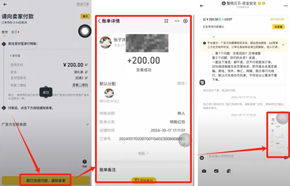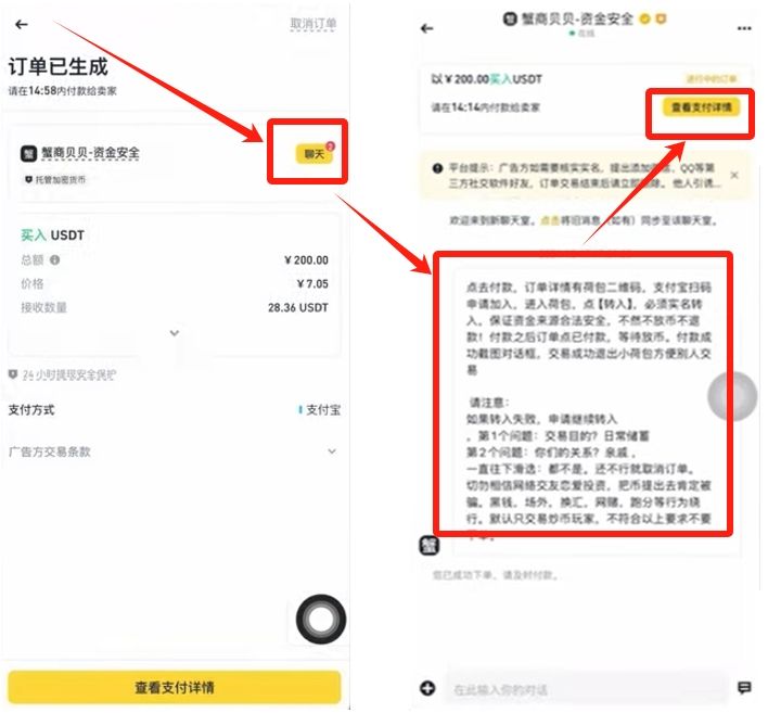 发完截图后商家确认就很快了。你可能会担心,钱转给对方不给我USDT怎么办?这一点其实不用担心,当我们在下单生成订单的时候,比如100USDT。币安就已经把卖家账号里对应的100USDT给锁定了,如果卖家不给我们放行的话,钱他也拿不走。钱不在他的手里,而在币安那里。同时商家账号前面也说了,他在币安平台里缴纳了保证金,还压了很多钱,如果我们拿着付款记录去找币安客服仲裁,一旦客户核实下来,我们确实按照商家的要求付款了,而商家没有把币转给我们,那平台一定会对商家进行处罚,扣除保证金第一时间给我们,所以在跟商家交易过程中的所有交流,一定要在币安官方这里的聊天框,这样方便客服去核实查证。整个流程有点像淘宝一样。