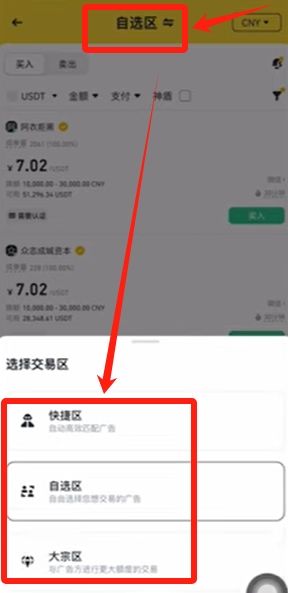这里大家可以看到有很多的商家在做兑换的生意。我们点击最上面的"自选区",可以自由的切换交易的方式。这里有快捷区、自选区还有大宗区三种,底下都有简单的说明。"快捷区"相对比较简单,就是系统会自动给你匹配一个商家,然后再进行交易,但是这些商家可能不一定优质。"自选区"就是我们可以自己来挑选和筛选想交易的商家。"大宗区"是适合交易金额比较大 ,就选择大宗区交易。通常我们选自选区来进行交易。