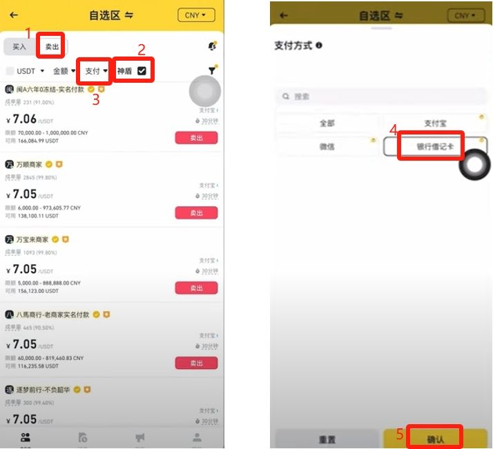 买币和卖币的入口都是一样的,只不过我们这次要点击左上方的【卖出】,这里很重要的一点不要忘了,点击神盾来筛选商家。在"支付"里选择我们希望的收款方式,我这里就选择"银行借记卡",点击【确定】。