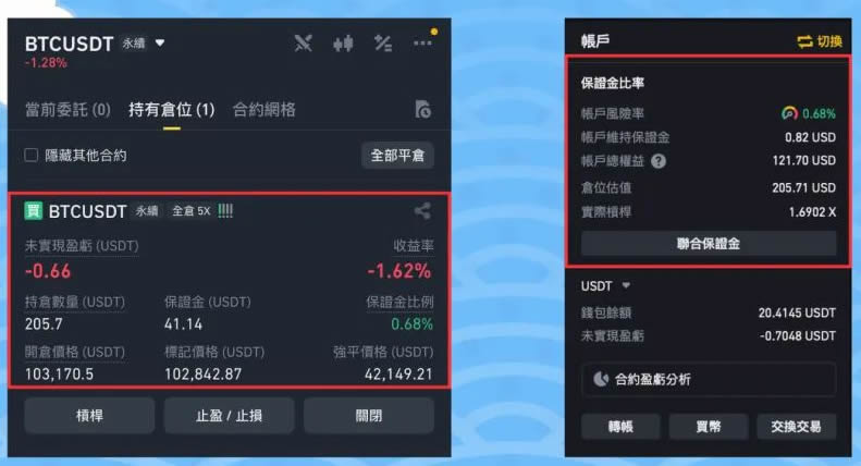 但如果你早就启用了「联合保证金模式」,系统就会以帐户总盈亏来判断风险,A 亏、B 赚会互相抵销,只要整体帐户价值还高于风险门槛,就不会爆仓。