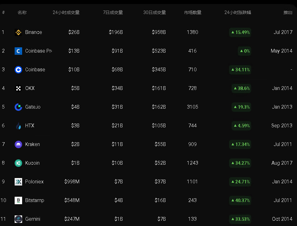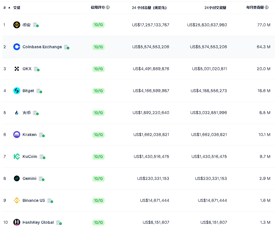 排名如下币安、Coinbase、欧易OKX、Bitget、火币、Kraken、KuCoin、Gemini、Binance US、HashKey Global、MEXC、Gate.io芝麻开门、Bybit
