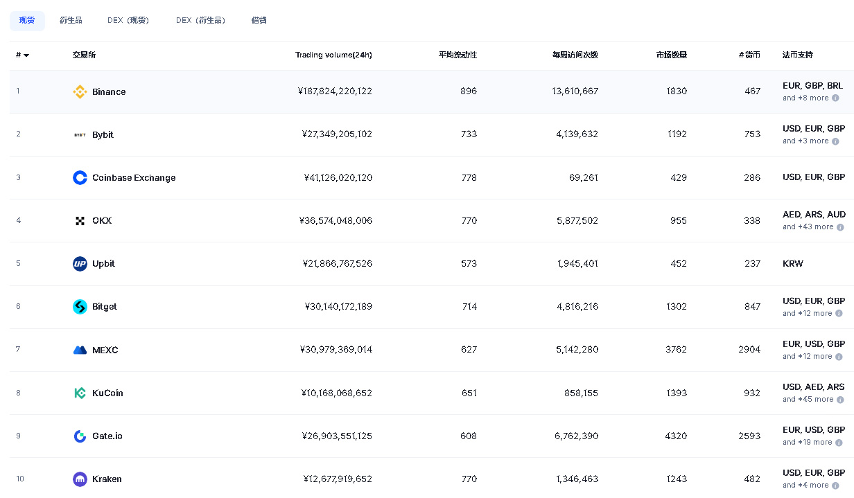 排名如下 币安Binance、欧易okx、Bybit、Coinbase、Upbit、Bitget、MEXC、KuCoin、Gate.io芝麻开门、Kraken