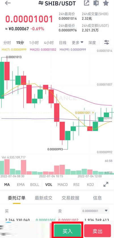 9、选择SHIB/USDT交易对,点击买入。