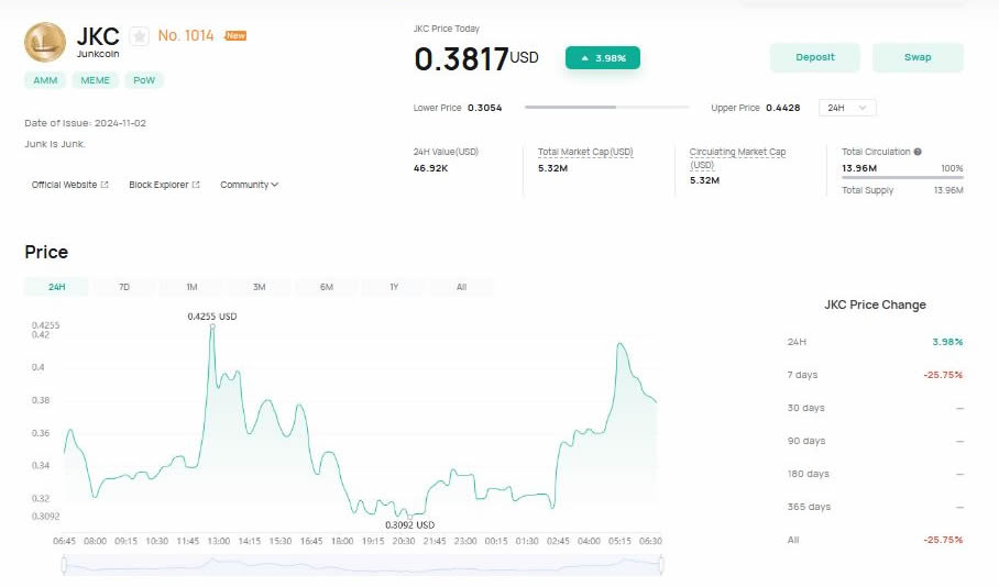 截至2024年12月2日,Junkcoin (JKC)价格为0.3817美元。在过去24小时内上涨了3.98%,表明在最近一些下跌后出现短暂回升。