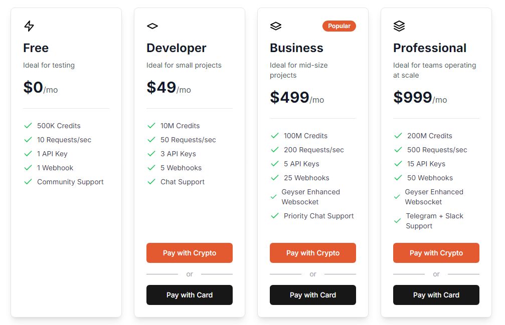Helius 目前尚未发币,但设计了积分玩法。针对不同规模的团队,平台提供了不同的定价套餐,支持法币或加密货币购买。套餐服务包括积分、API Keys、Webhooks 和客户支持等,其中,积分用来访问和使用平台产品和服务。