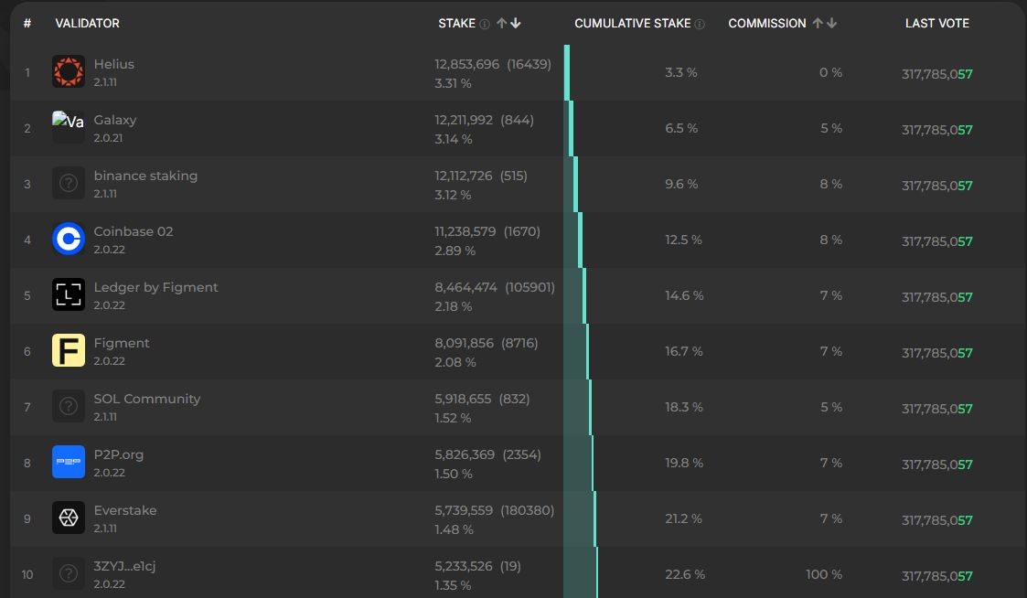 Solana 采用权益证明机制,由验证者维护网络安全和去中心化。最新数据显示,Solana 全网验证者数量为 1,416,其中,Helius 是最大的验证者,质押超过 1,285 万枚 SOL,紧随其后的验证者是 Galaxy、Binance Staking 和 Coinbase。